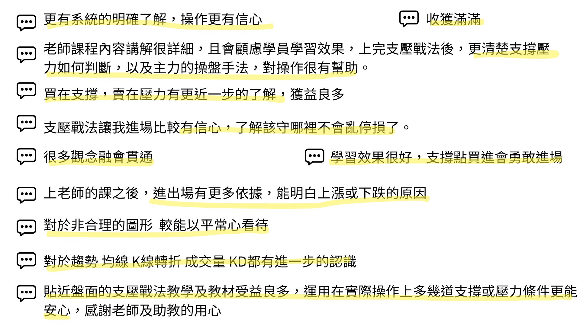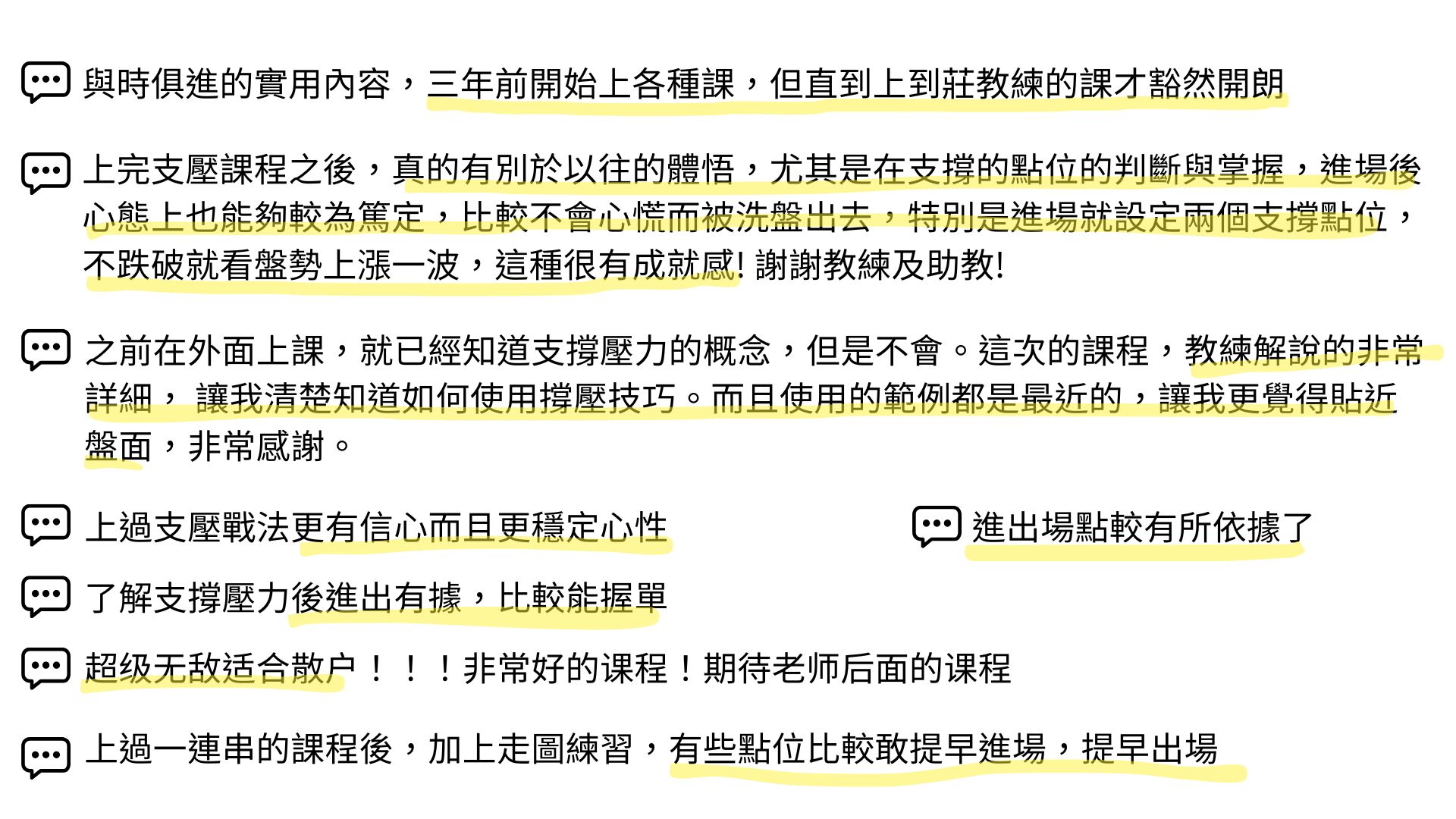 老師會將「支撐壓力」的進出場方式整理成SOP,皆為「實戰應用」技巧,