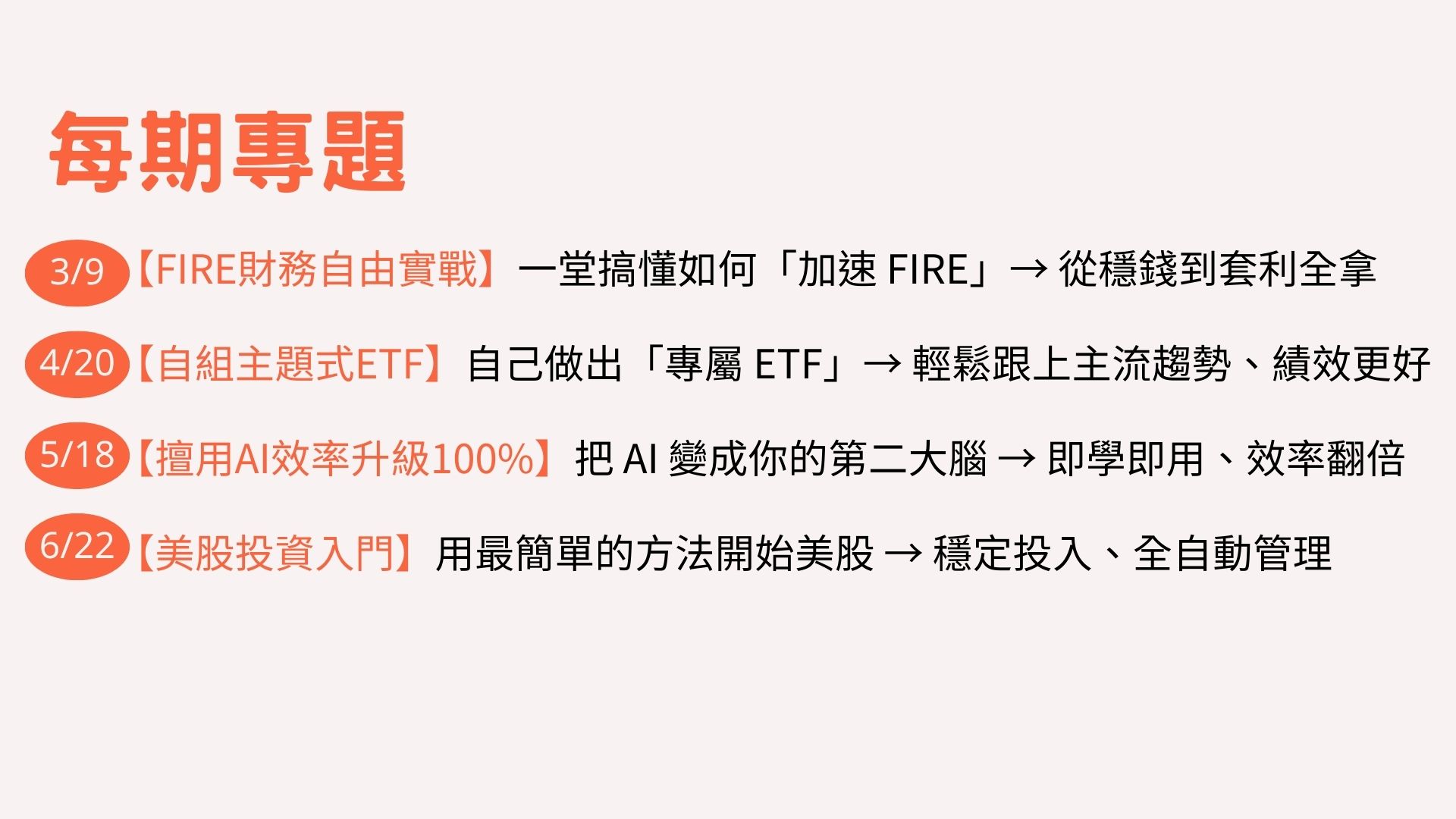 我們以「主題式深度小課」為核心,將複雜的投資觀念拆解成人人都能吸收的實用方法,並以每期不同主題帶你構築更完整的投資體系──從建立穩定現金流、打造專屬 ETF、運用 AI 工具,到以自動化方式進入美股市場