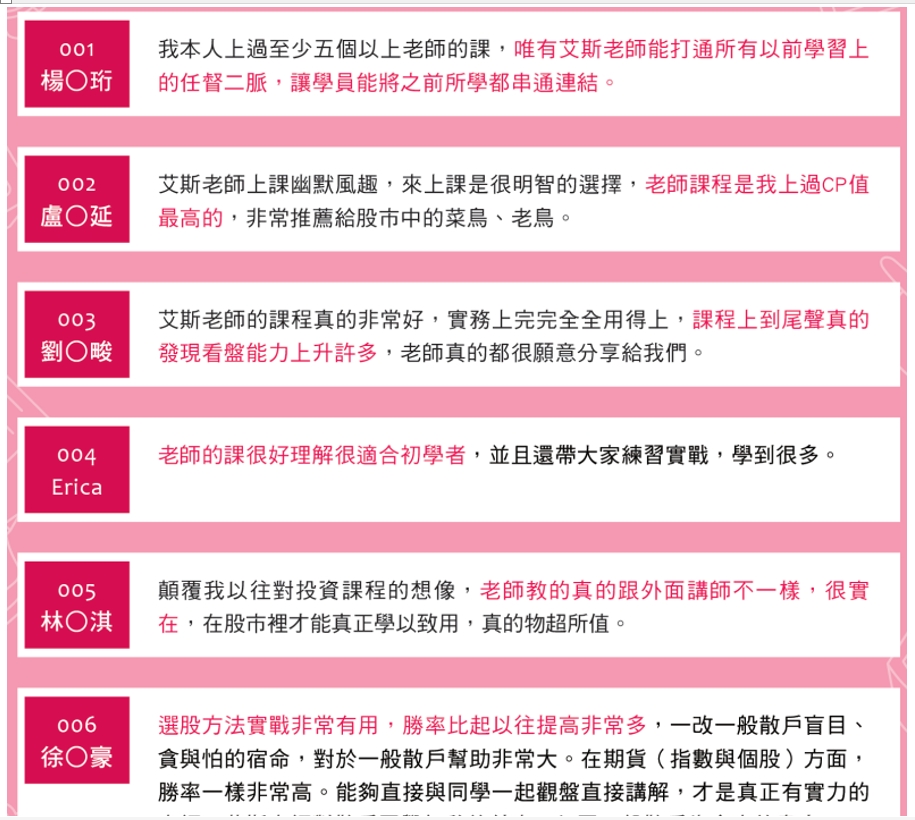 阿Sir.艾斯老師過往以來專職做培訓、也教出不少月入百萬、甚至千萬的交易好手,更是有不少學員從完全不懂的股市菜鳥小白、變成證期分析師的都有好幾位;我也深知學員在交易期摸索期與調整期以及穩定期所欠缺的東西是什麼,這套課程透過幫學員做實盤的解說,以及觀察學員實盤(模擬)操作績效檢驗與互動教學,相信可以幫學員做到客製化處理、解決其交易盲點與痛點,藉以提升操作績效。