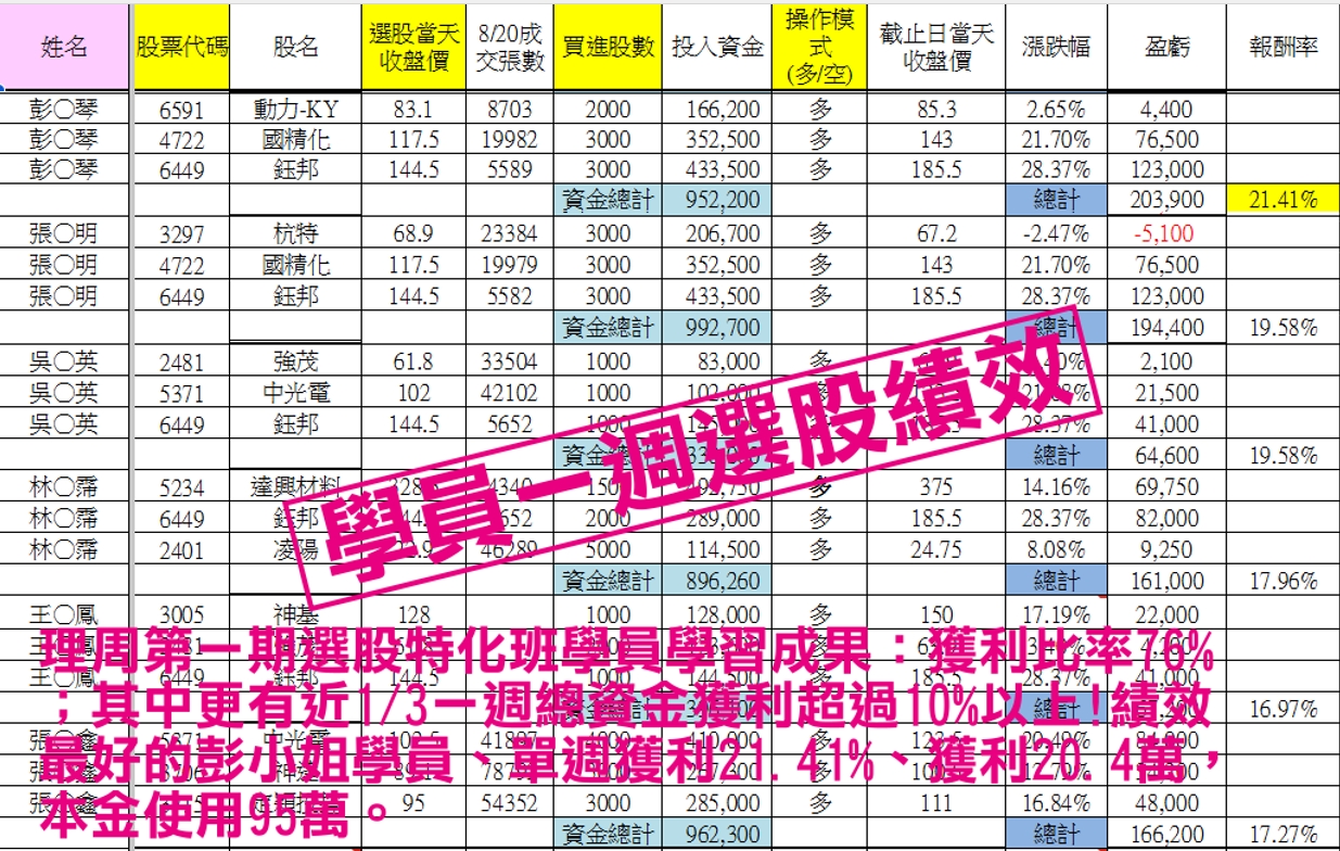 2025年8月/理周第一期選股特化班學員學習成果:獲利比率76%;其中更有近1/3一週總資金獲利超過10%以上!績效最好的彭小姐學員、單週獲利21.41%、獲利20.4萬,本金使用95萬。(註:仍需視市場行情與學員狀況而有所差異、僅供參考,不作為績效保證,特此說明!)