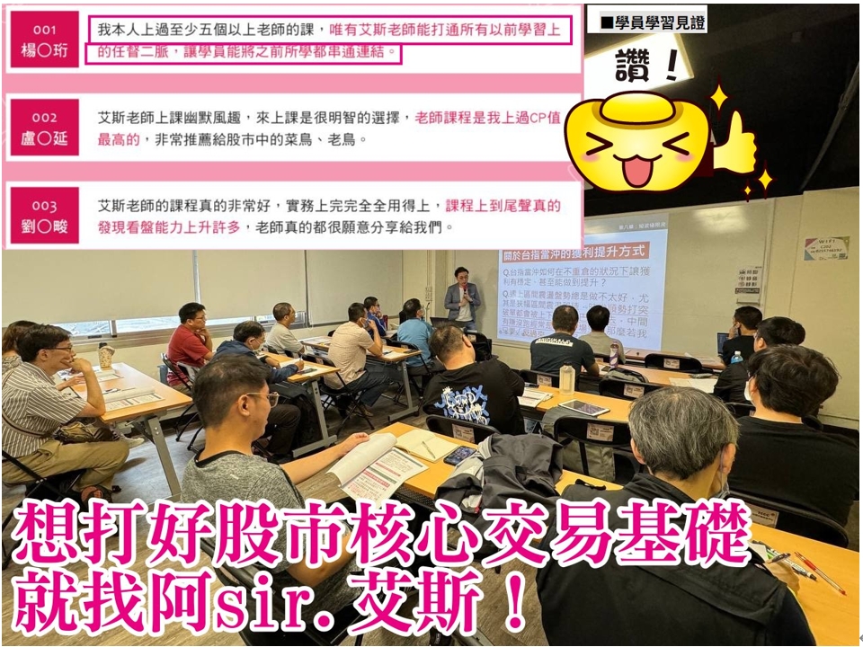 這是專為股市新鮮人設計的核心基礎課程,能夠快速且有效提升對於股市操作的認知與操作績效。阿Sir.艾斯老師公認有效且有用的教學口碑與實例有目共睹,近二十年市場操作經驗歸納,可少走冤枉路!