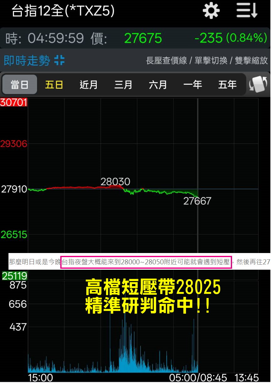 📌 台指夜盤(12/15)先上後下、來到昨晚教學文章抓的短壓帶28025附近就一路往下走低、收在幾乎最低;最高28030、最低27667,收27675、下跌-235點,漲幅-0.84%、法人在日盤與夜盤籌碼不太一致,三大法人日盤偏多+1596口(外資-4654口),夜盤多空各有;台積電ADR-1.47%、富台-0.65%;